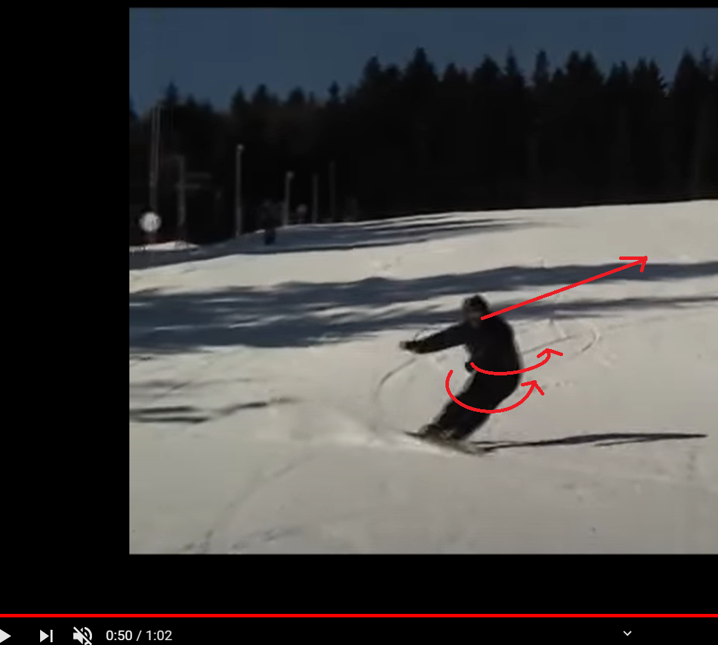 To wraz z głową wymusi rotację tułowia i bioder które powinny być usatwione prostopadle do kątów wiązań (http://snowboardacademy.pl/pozpod.html -> Rotacja Tułowia) lub jak ćwiczenie nawet zrotowane jeszcze badziej w kierunku skrętu, wręcz prostopadle do deski.